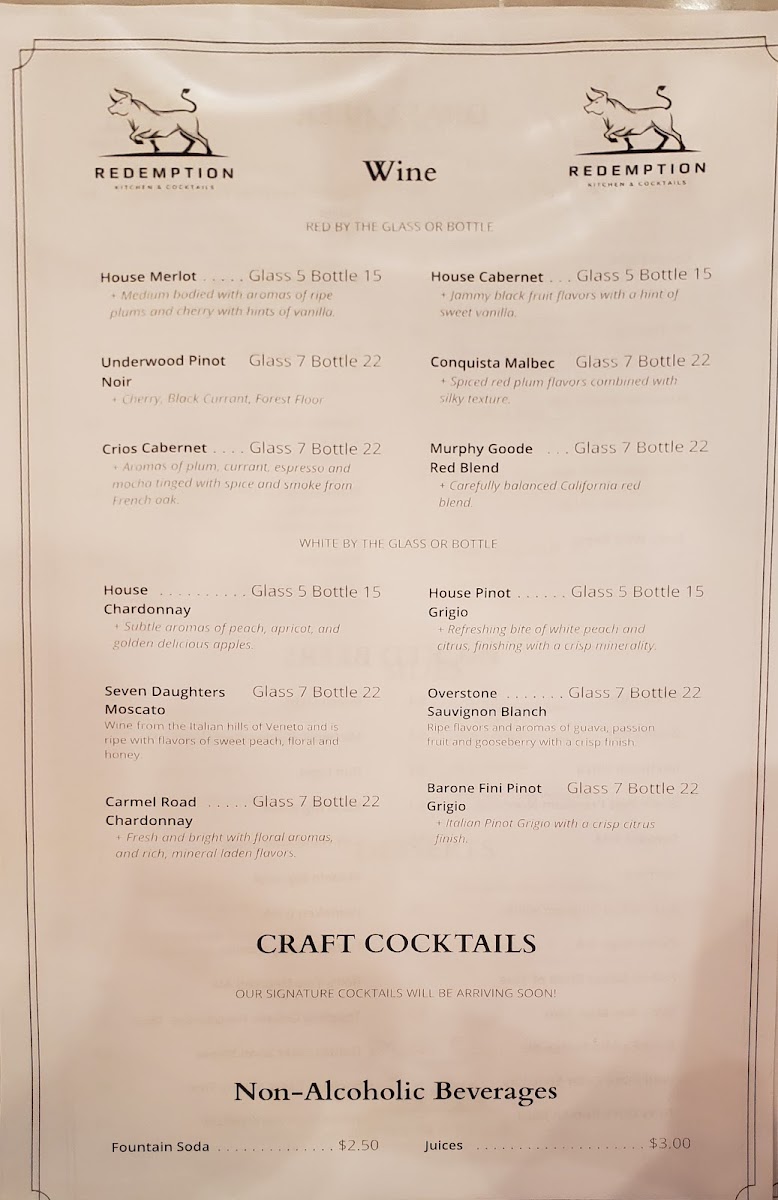 Complement your meal with great selections of red wines such as McManis Merlot for a well-rounded dining experience. From the attentive service to the intricately prepared dishes, Redemption Restaurant promises an unforgettable outing for every visitor.